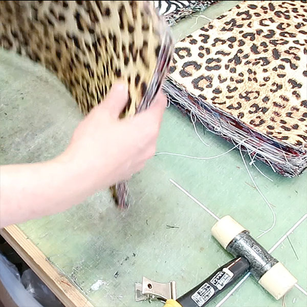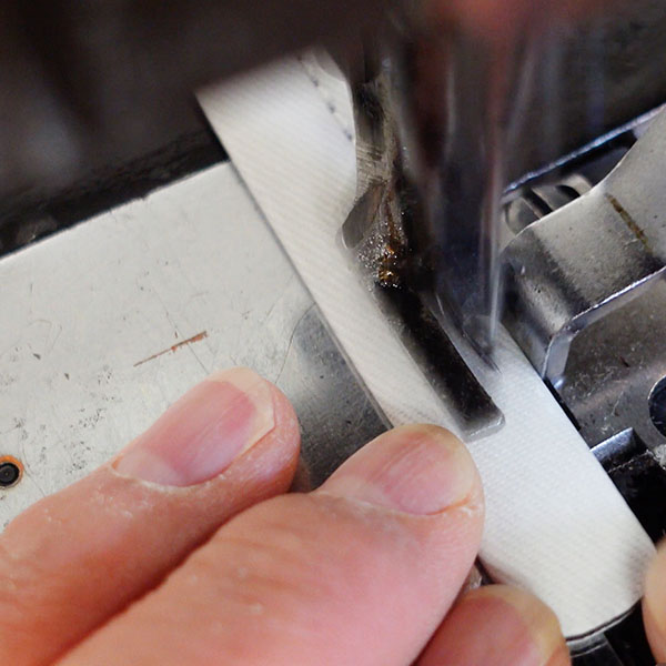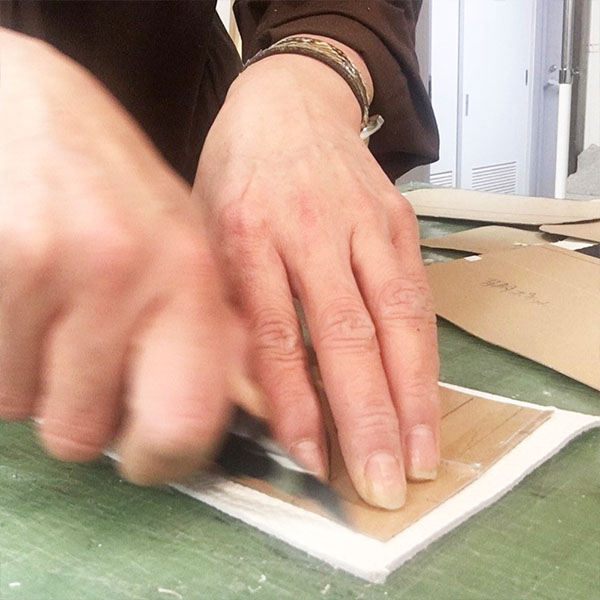 その商品で一番ステキに映える柄の入り方を考えて、一枚ずつ丁寧に裁断します。職人さんも商品の顔になる非常に大事なパートなので慎重に作業します。